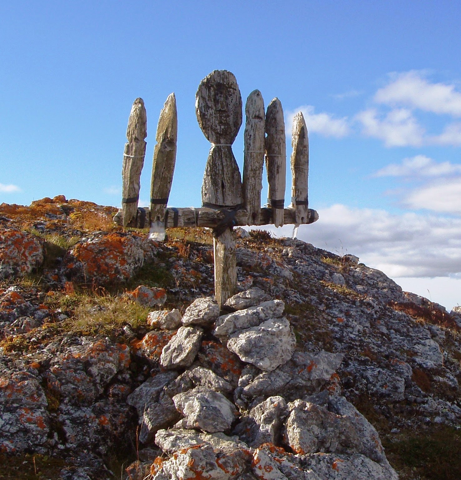 На этот раз это были обычные колья 30-100 см длины с примитивно вырезанными на верхних концах лицами. По древней традиции лица их были обращены на восток, а на губах запеклась кровь жертвенных оленей. На наиболее длинных кольях висели оленьи черепа, а на земле лежали копыта животных. Кстати, Шренк подтвердил, что ненцы не захотели везти Вениамина и его товарищей в глубь острова: «Самоеды же, до сих пор добровольно принимавшие христианскую веру, стали бояться, чтобы миссионеры не проникли дальше, а потому отказывали им в оленях» .